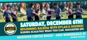 Ever wanted to learn the basics of Balboa? Now's your chance to learn it from two fantastic guest instructors, Dylan Devotta and Desiree Roffers! Balboa is a swing dance that’s characterized by its use of small space and subtle weight changes. This class will cover Balboa basics and Bal-Swing which merges swing movement with Balboa all in one day. This dance is performed in “close embrace” and we will be rotating partners in class. No partner or experience required. Dancers are encouraged to bring slick-soled shoes or socks to dance in. 10:00am-12:30pm: 2.5 hours of class. 12:30pm-2:00pm: Lunch break. 2:00-4:30pm: 2.5 hours of class. Class room: Lower Studio Instructors: Dylan Devotta (Minneapolis) and Desiree Roffers (Chicago) Price: Pay what you can. Suggested $50. Registration: Live now!